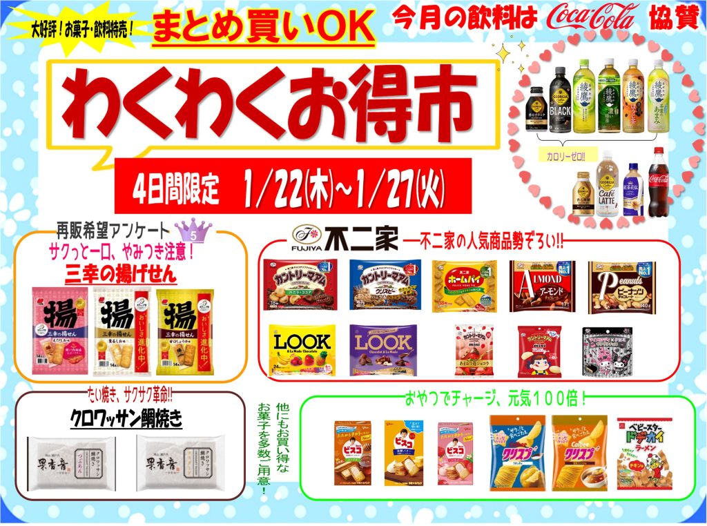 今月は22日(木)から27日(火)の期間、わくわくお得市を実施いたします。