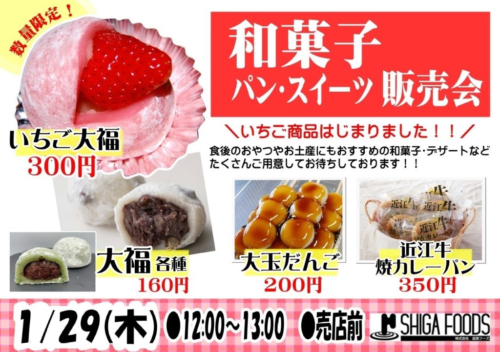 2026/01/27 即売会 滋賀1売店 滋賀フーズ即売会 今週29日(木)は滋賀1中央と東の同時開催で滋賀フーズの即売会を実施いたします! 人気のいちご大福をはじめ、和洋菓子やカレーパンを販売いたします。 給与控除も可能となっておりますので、ぜひご利用ください。