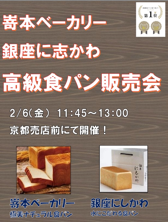 2026/02/03 即売会 京都 高級パン即売会 今週6日(金)は京都にて高級パンの即売会を開催いたします! 嵜本の食パン・クロワッサン・塩トリュフパン、に志かわの食パンなどを販売いたしますので、ぜひこの機会にご利用ください。