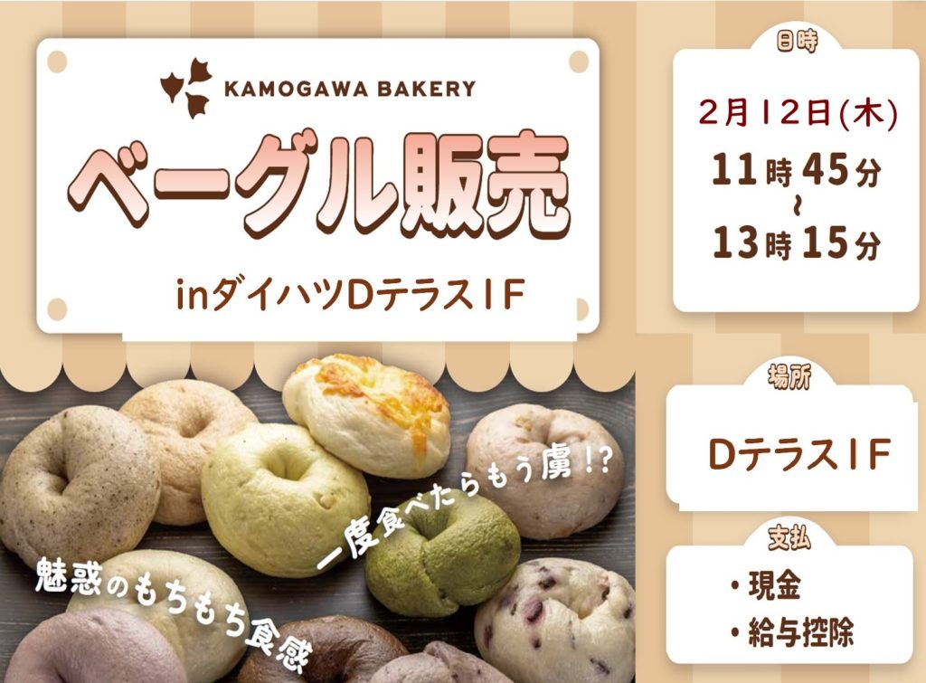 2026/02/06 即売会 Dテラス鴨川ベーカリーベーグル即売会 来週12日(木)はDテラスにて鴨川ベーカリーの即売会を実施いたします。 前回大好評だったベーグルの即売会の再開催となりますので、ぜひこの機会にご利用ください。