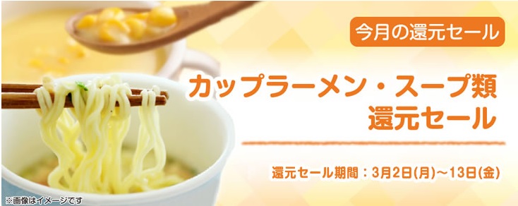 2026/02/27 セール カップラーメン・スープ類還元セール 3月2日(月)から13日(金)の期間、カップラーメン・スープ類の還元セールを実施いたします。 対象商品は通常生協価格の約25%オフになります。 まだまだ寒い日もありますので、ぜひお昼ごはんなどにご活用ください!