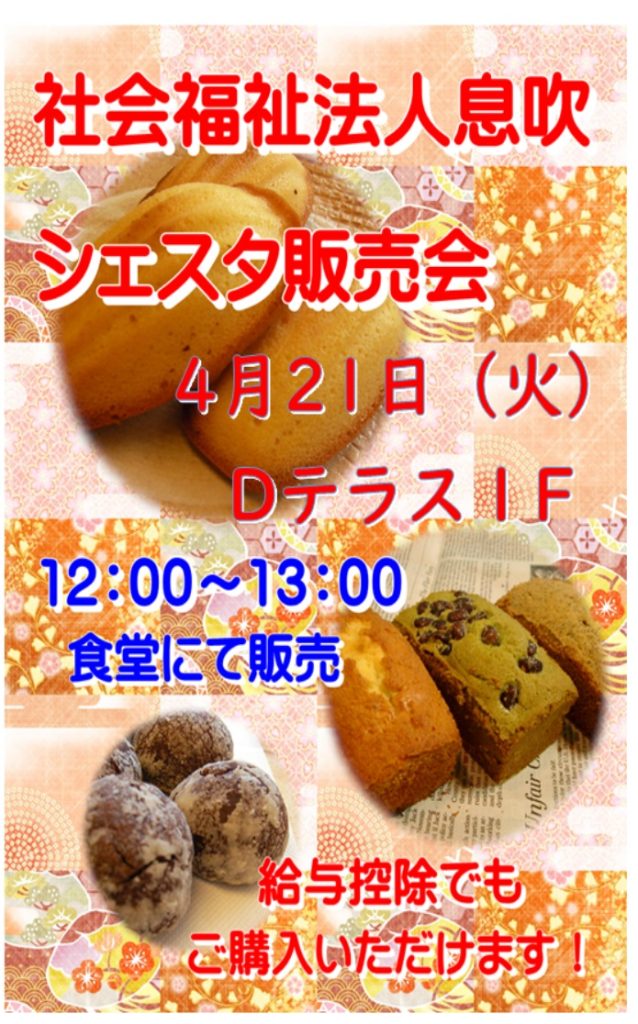 来週21日(火)はDテラスにてシエスタ焼菓子即売会を実施いたします。