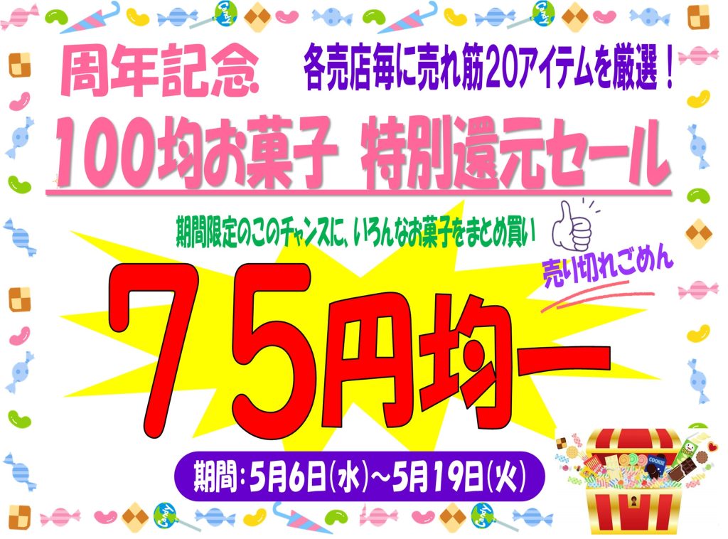 連休明けの5月6日(水)から19日(火)の期間、100均お菓子の還元セールを実施いたします!
