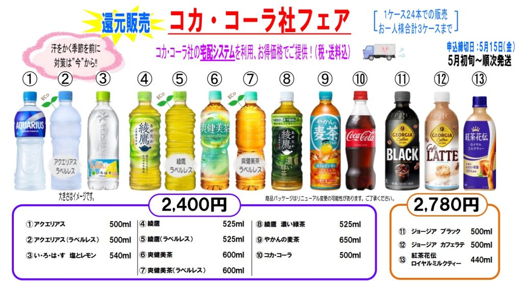 5月の還元斡旋はコカ・コーラ社フェアとして、ペットボトル飲料がお得になっております。