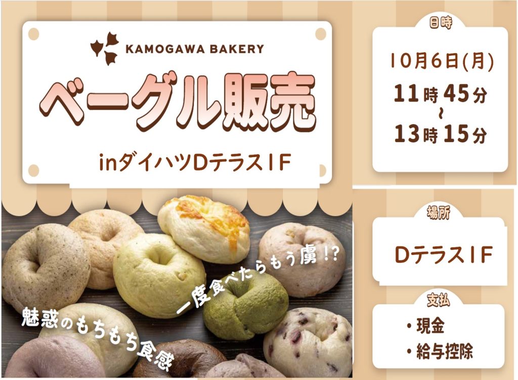 来週10月6日(月)はDテラスにて、鴨川ベーカリーの即売会を実施いたします。