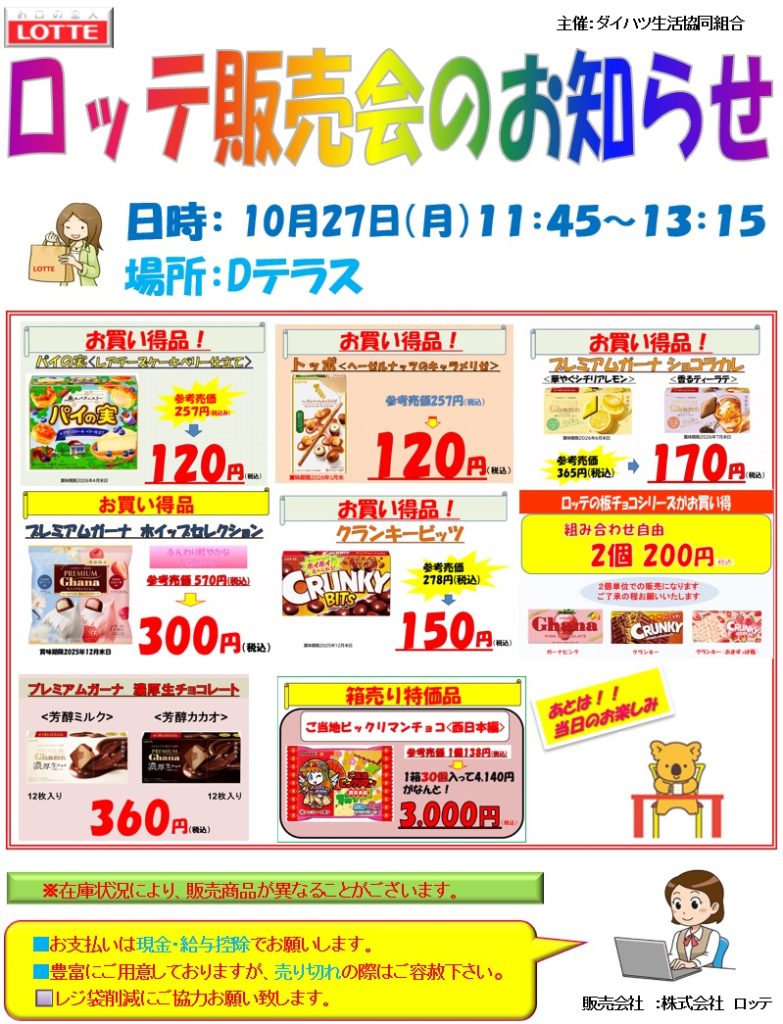 来週10月27日(月)はロッテお菓子の即売会をDテラス売店前にて実施いたします。