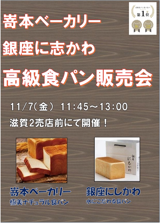 今週11月7日(金)は滋賀2売店前にて高級パンの即売会を開催いたします!