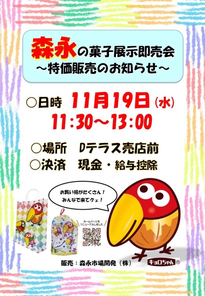 2025/11/13 即売会 Dテラス 森永お菓子即売会 来週19日(水)はDテラスにて森永の即売会を実施いたします! さまざまな森永商品をお得にお買い求めいただけます! 給与控除も可能となっておりますので、ぜひこの機会にご利用ください。