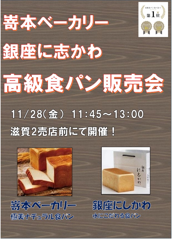 2025/11/27 即売会 滋賀2 高級パン即売会 明日28日(金)は滋賀2売店前にて高級パンの即売会を開催いたします! 嵜本の食パン・クロワッサン・塩トリュフパン、に志かわの食パンなどを販売いたしますので、ぜひこの機会にご利用ください。