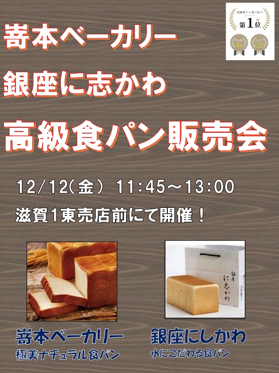 2025/12/04 即売会 滋賀1東 高級パン即売会 来週12日(金)は滋賀1東売店前にて高級パンの即売会を開催いたします! 嵜本の食パン・クロワッサン・塩トリュフパン、に志かわの食パンなどを販売いたしますので、ぜひこの機会にご利用ください。