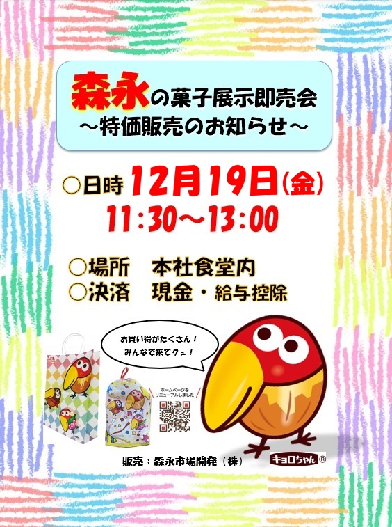2025/12/15 即売会 本社 森永お菓子即売会 今週19日(金)は本社にて森永の即売会を実施いたします! さまざまな森永商品をお得にお買い求めいただけます! 給与控除も可能となっておりますので、ぜひこの機会にご利用ください。