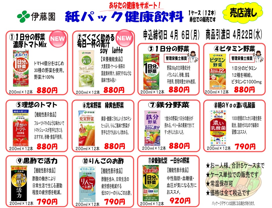 4月の還元斡旋商品は伊藤園の紙パック健康飲料です!