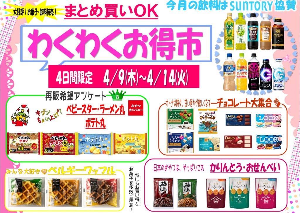 今月は少し早めの開催!来週9日(木)から14日(火)の期間、わくわくお得市を実施いたします。