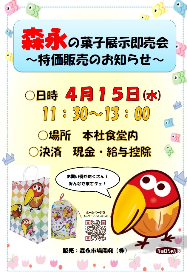 2026/04/13 即売会 本社 森永お菓子即売会 15日(水)は本社にて森永の即売会を実施いたします! さまざまな森永商品をお得にお買い求めいただけます! 給与控除も可能となっておりますので、ぜひこの機会にご利用ください。